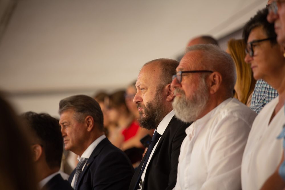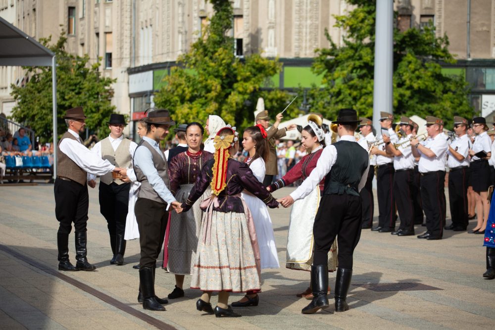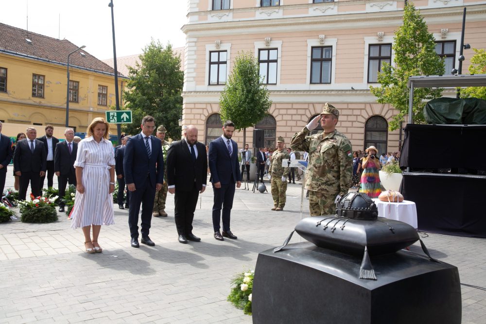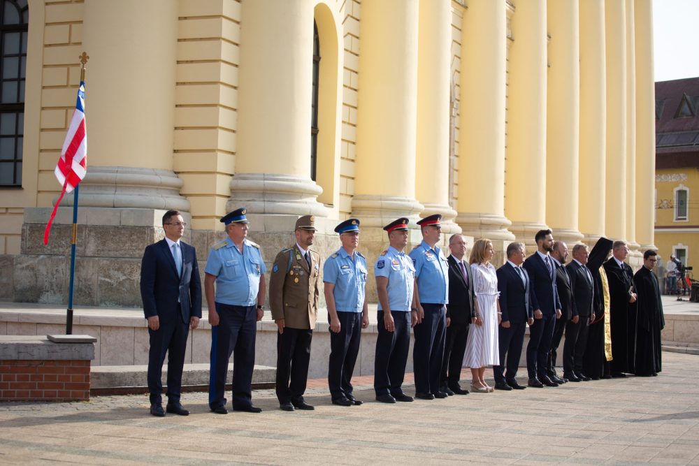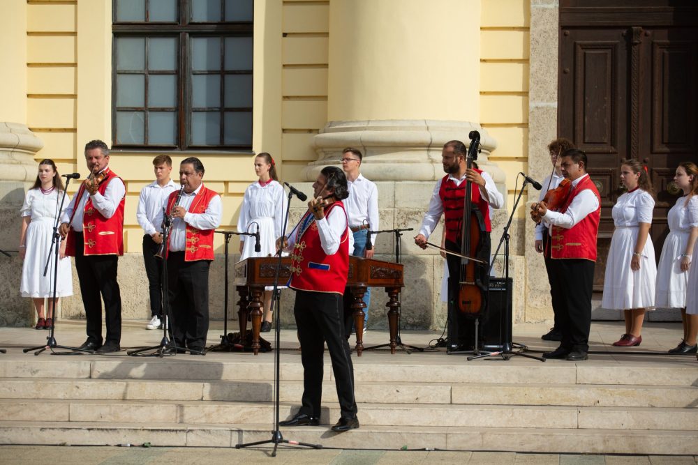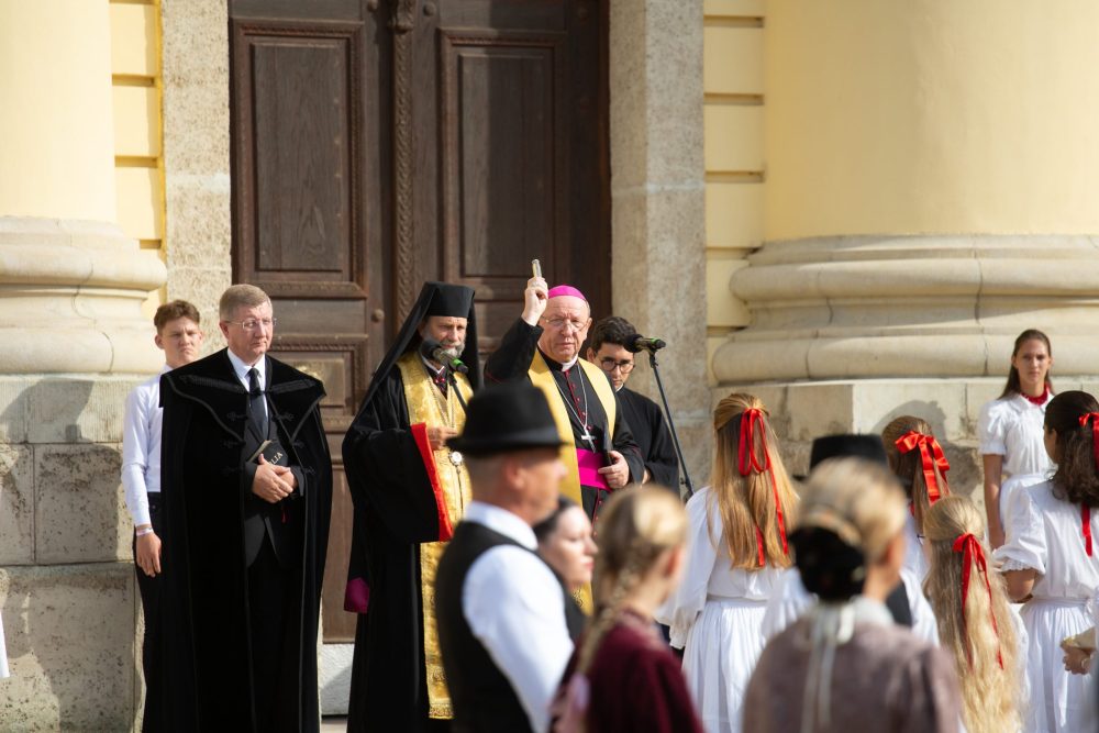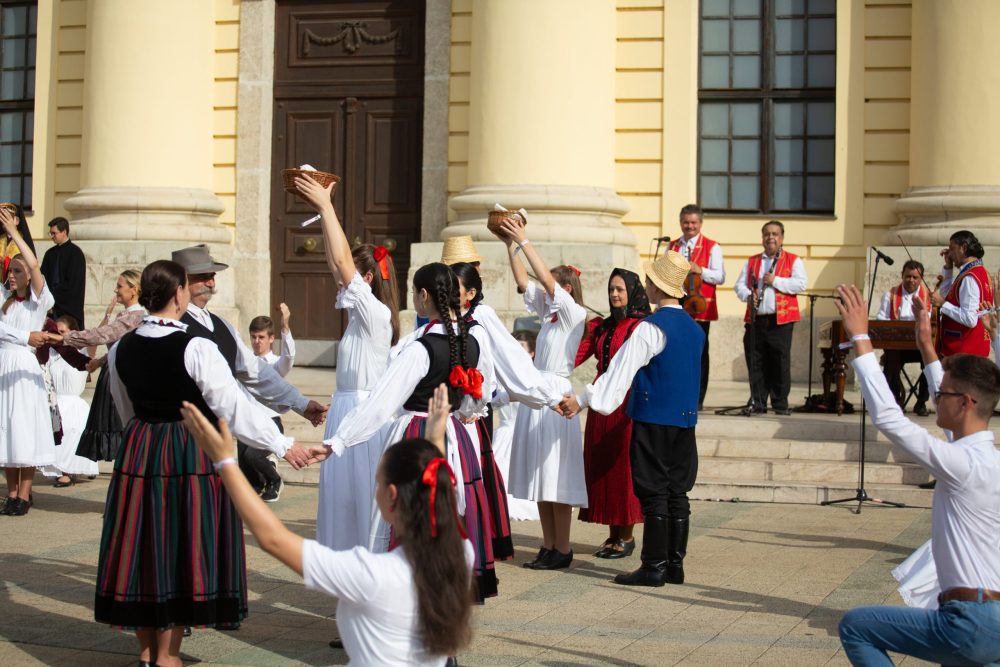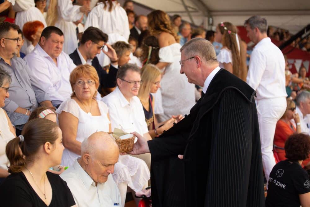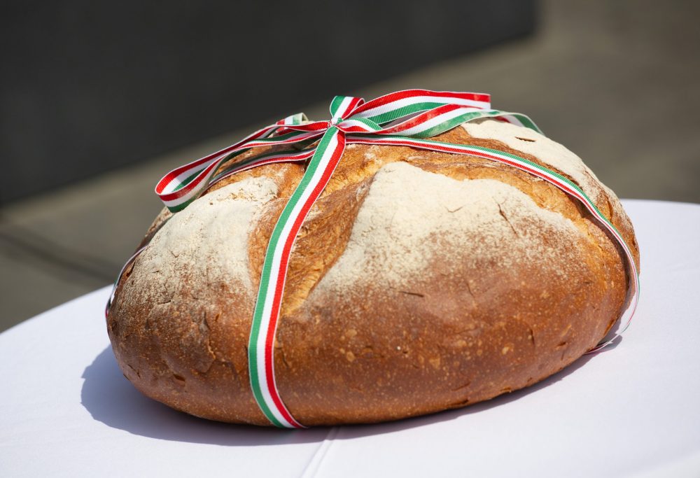 Ezt követte a nemzeti színű szalaggal átkötött kenyér ünnepélyes megszentelése aminek darabjait szétosztották.
