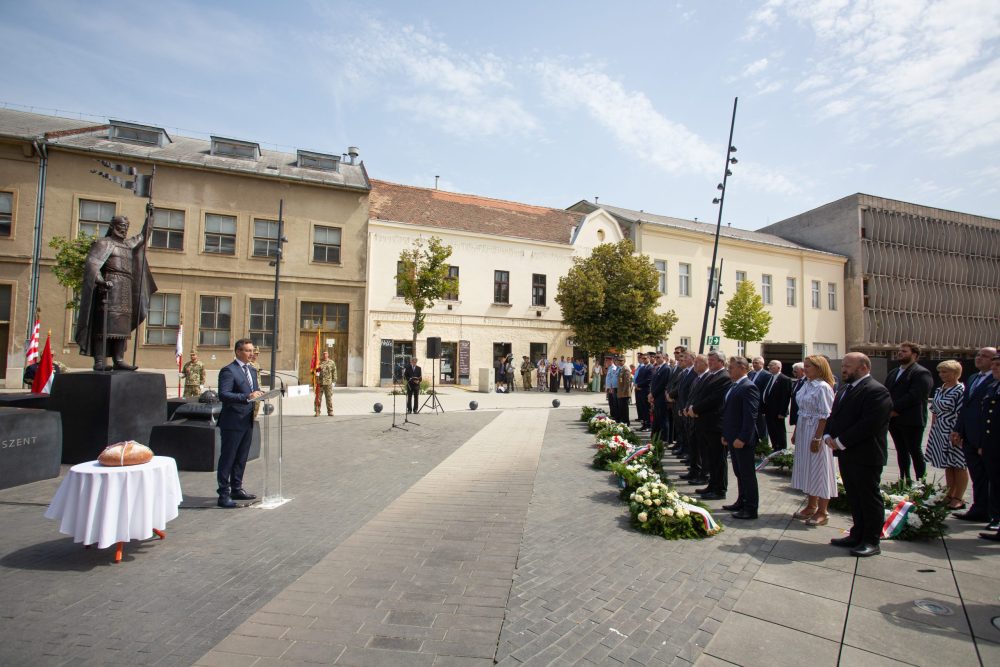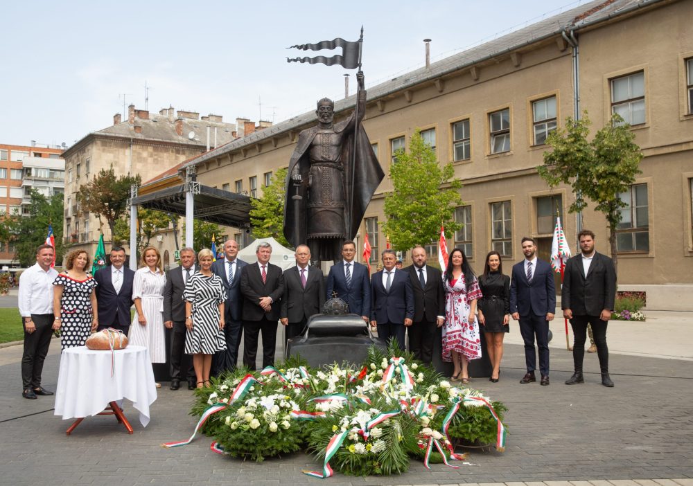 A hagyományokhoz híven ezúttal is megkoszorúzták Szent István szobrát a Dósa nádor téren