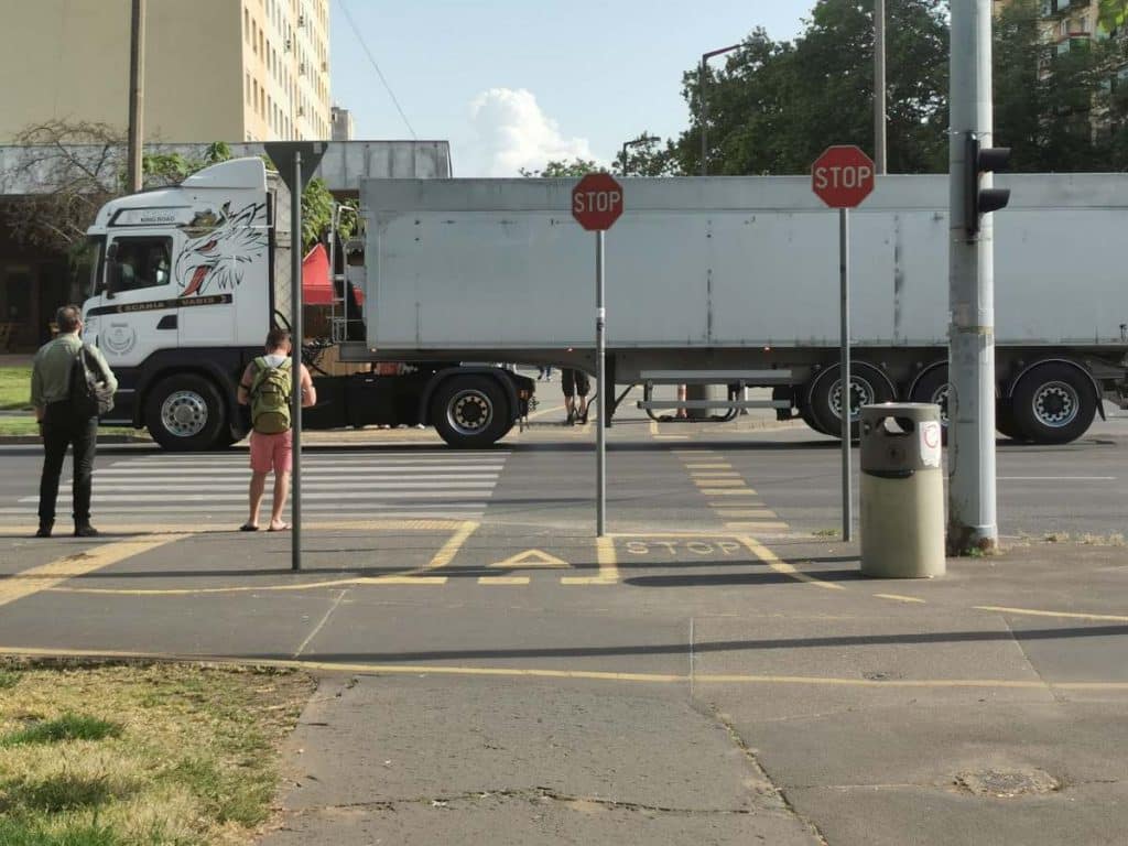 Azonban kikerült egy második STOP tábla is, a sáv bal oldalára, így most a két sáv között, középen is elhelyezkedik látszólag feleslegesen egy STOP tábla, amely ráadásul balesetveszélyt is hordozhat, hiszen ha megakad benne egy kerékpáros, abból csúnya esés lehet.