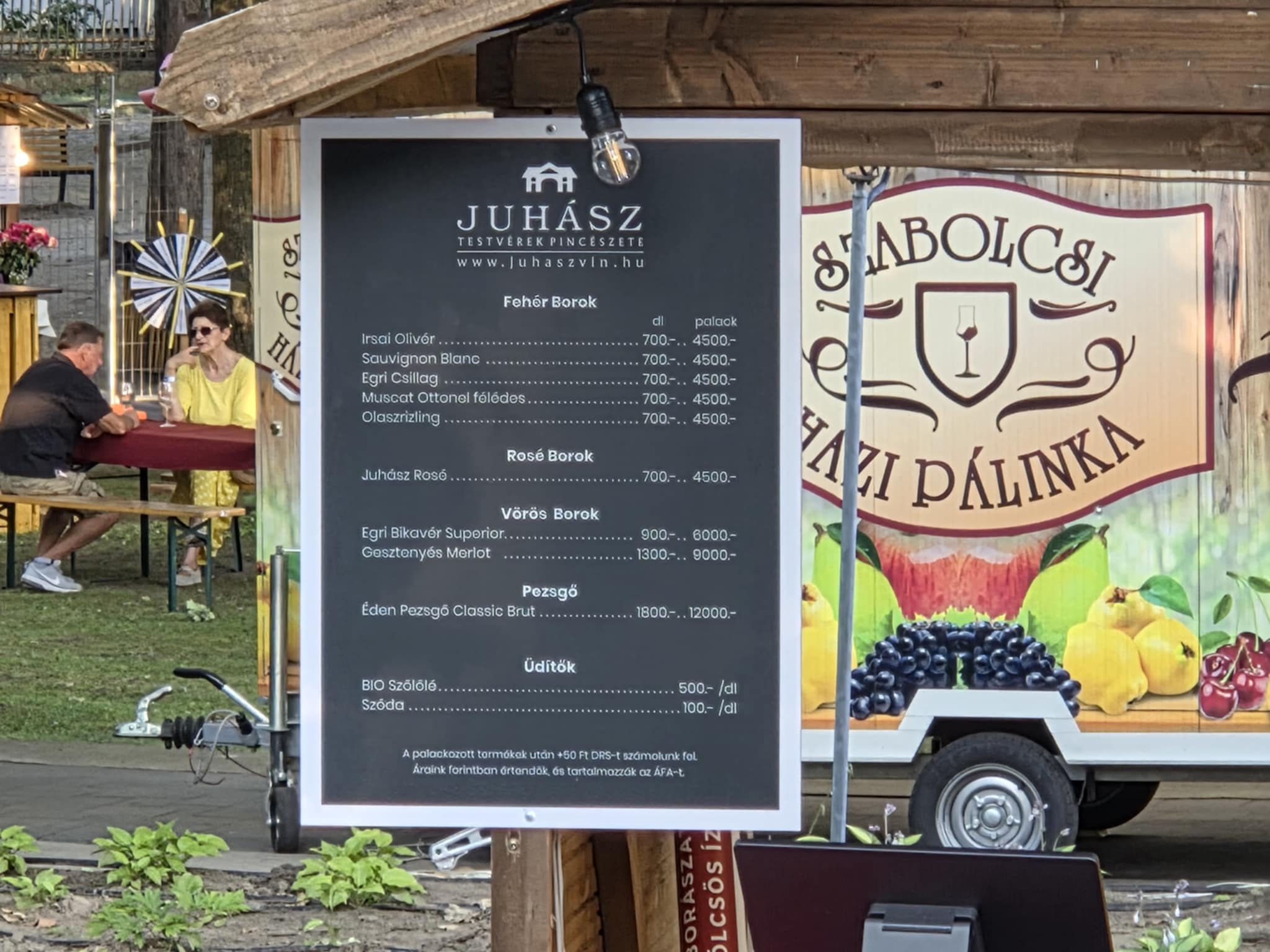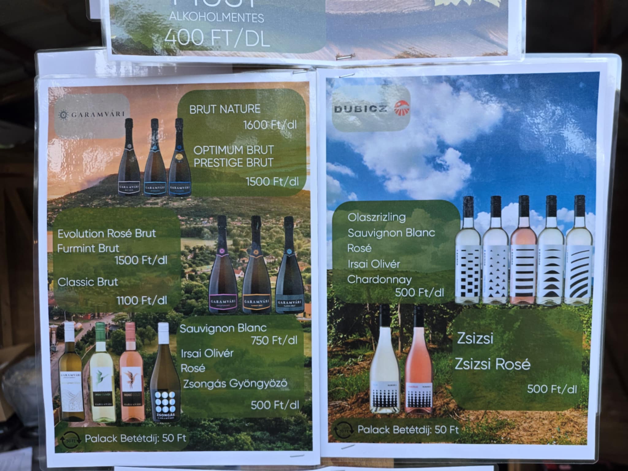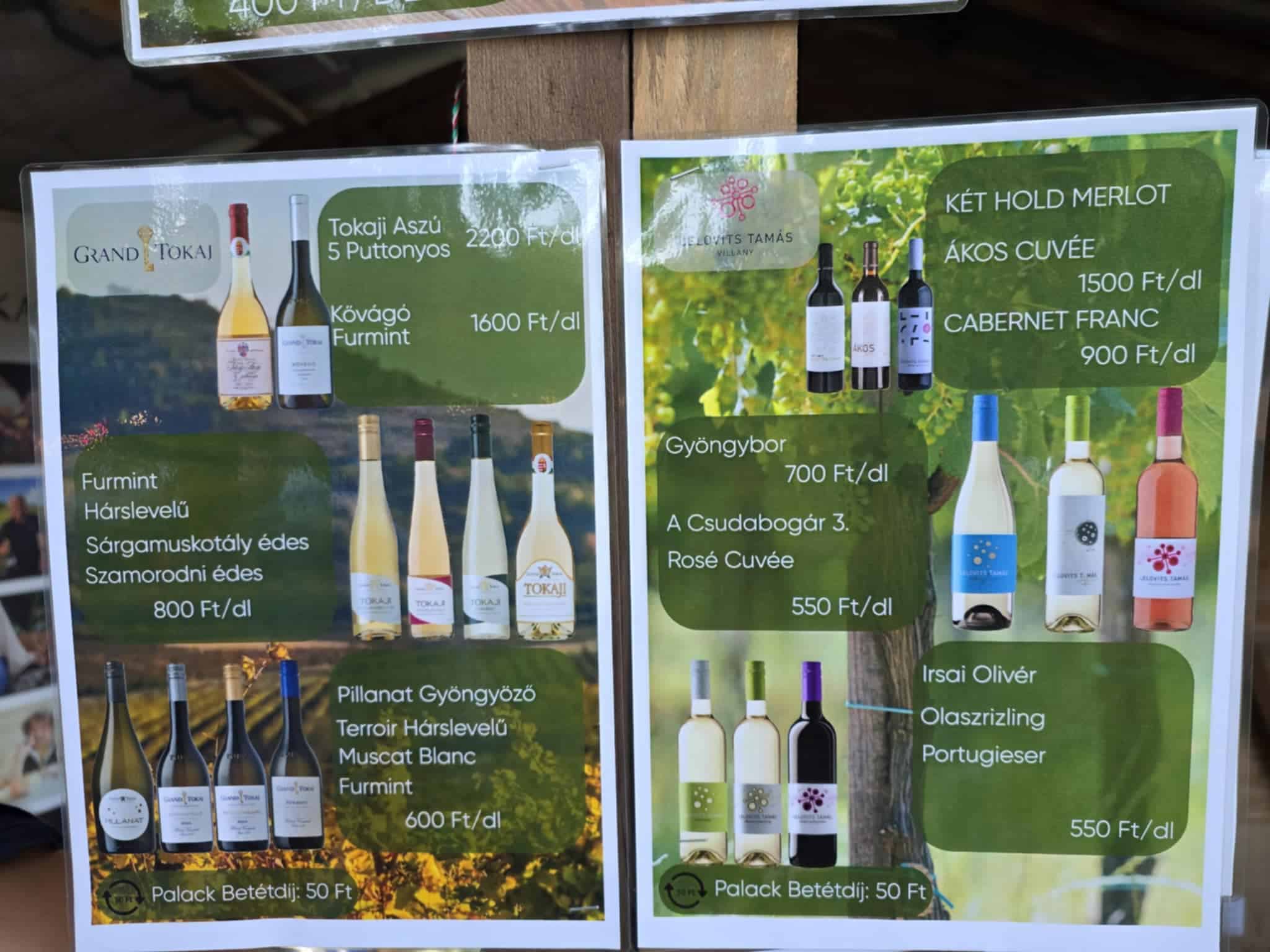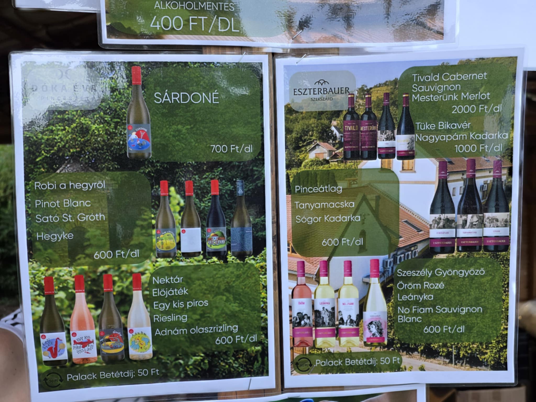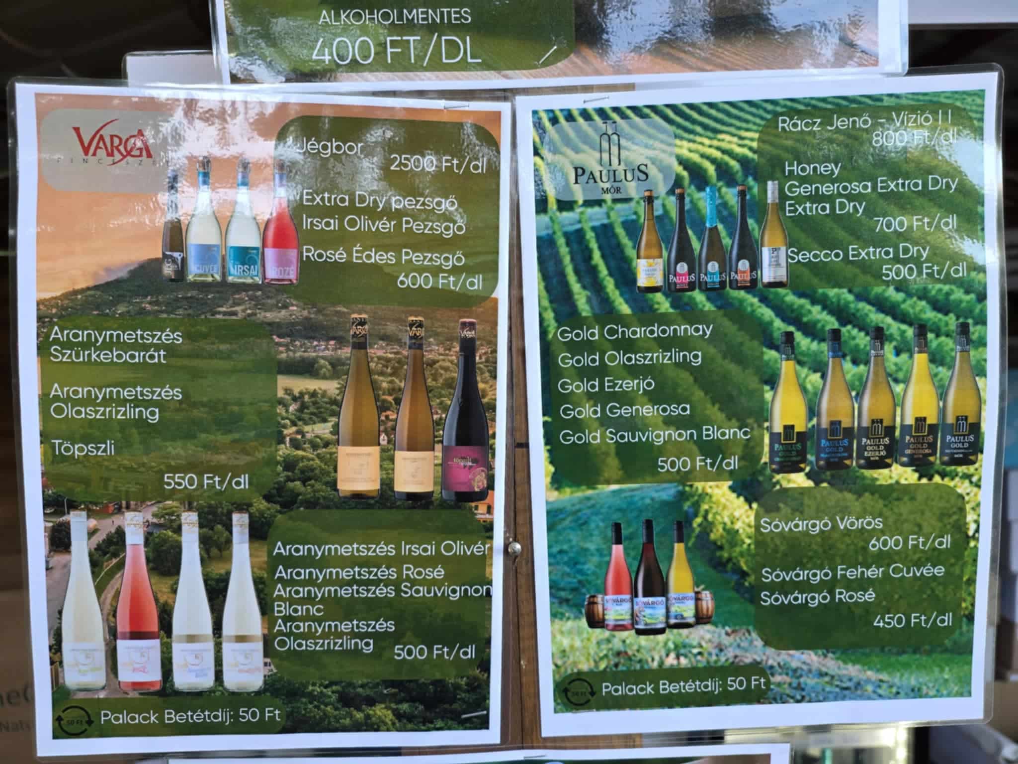 Az ital árak nagyon változatosan alakulnak. Találni borokat már 450 forint/deciliter áron is. A könnyedebb fehérborok jellemzően 500-700 forint/dl áron érhetők el. Láttunk 5 puttonyos Tokaji Aszút 2200 forint/dl áron és Varga Jégbort 2500 forint/dl áron. Pezsgők akár 700 forint/dl áron, de nem ritka az 1500/dl ár a buborékos nedűért.